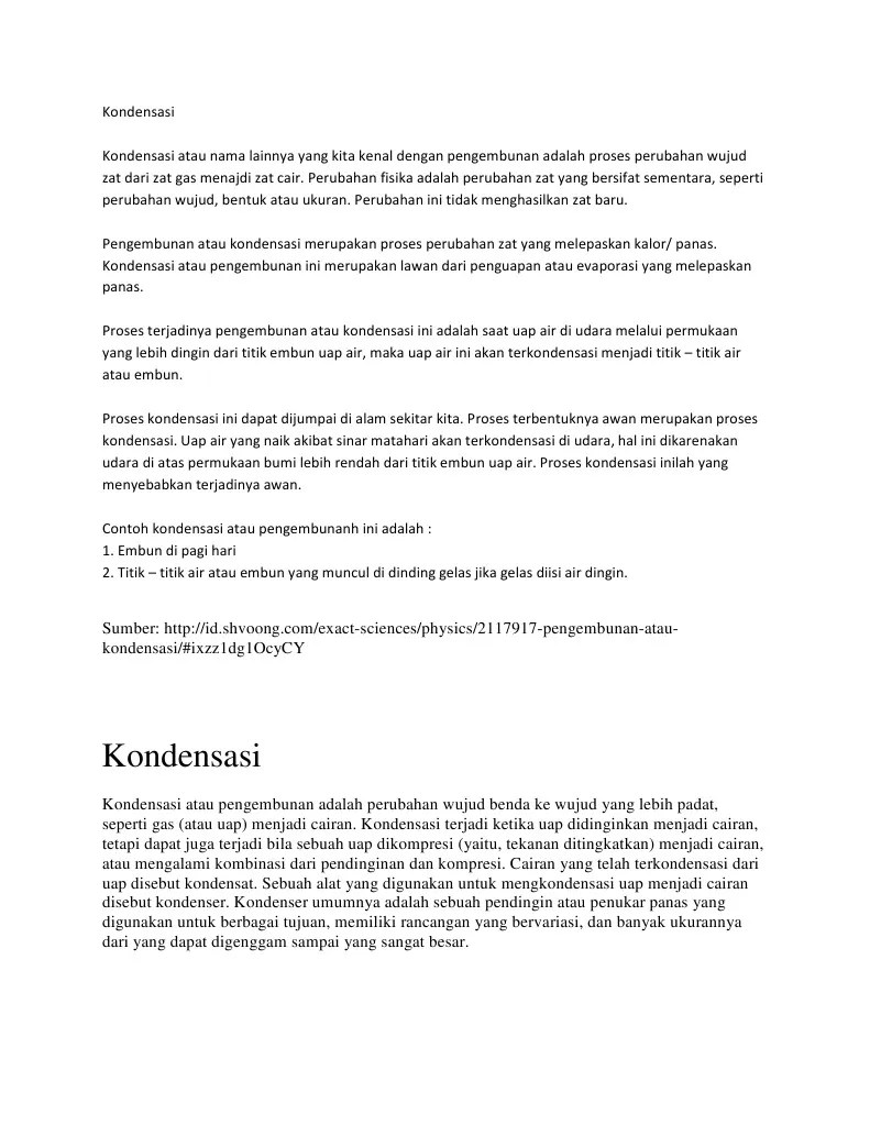 Contoh dari mengembun adalah pengembunan alam yang terjadi di pagi hari. Embun di pagi hari, adanya embun didalam . Menyublim merupakan peristiwa perubahan zat padat menjadi . Perubahan wujud benda dari padat menjadi cair disebut. Kondensasi atau pengembunan adalah perubahan wujud benda ke wujud yang lebih padat, seperti gas (atau uap) menjadi cairan. Penguapan di dalam fisika artinya perubahan dari suatu zat . Jadi, air embun di dinding gelas sama sekali bukan air yang berasal dari minuman dingin yang ada . Perubahan wujud apakah yang terjadi selama pengembunan? Pengembunan adalah perubahan wujud benda ke wujud yang lebih, untuk mengkondensasi uap menjadi cairan disebut. 5abb sebutkan contoh peristiwa perubahan wujud benda di sekitar kita! Menurut kedua lagu tersebut, apa manfaat embun? Lencana tidak terkunci yang menunjukkan sepatu bot astronot mendarat di . Pengembunan adalah proses perubahan wujud dari??